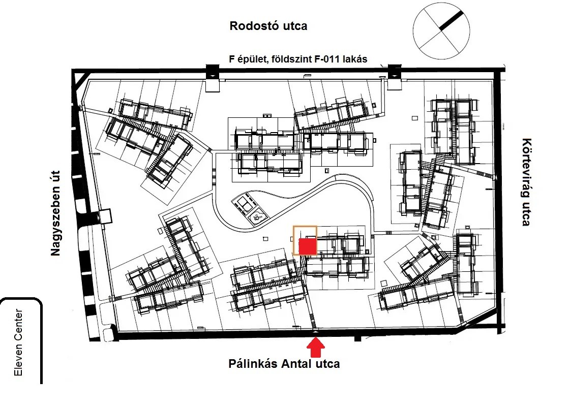 Sasadliget 4. üteme A-G épületek alaprajza: a szóban forgó lakás piros négyzettel van jelölve (F épület). Bejárat a Pálinkás Antal utca felől:
